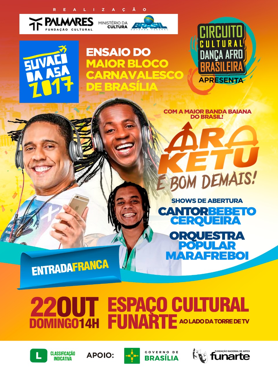 Som de qualidade e energia baiana invadem o Distrito Federal neste final de semana com shows dos grupos Filhos de Jorge e Araketu na Funarte. Com mistura de ritmos latinos e axé, a banda Filhos de Jorge se apresenta neste sábado (21/10), às 14h, com os sucessos Molinho e Ziriguidum, e as novas Deixa o Corpo Falar e Vai Que Cola. No domingo (22/10), às 14h, é a vez do grupo Araketu retornar à cidade com um repertório dançante e eclético, que inclui canções que marcaram os anos 90, como Mal Acostumado e Araketu é Bom Demais. A iniciativa é do Circuito Cultural de Dança Afro-Brasileira, da Fundação Cultural Palmares (vinculada ao Ministério da Cultura), que conta com o apoio do Governo de Brasília.