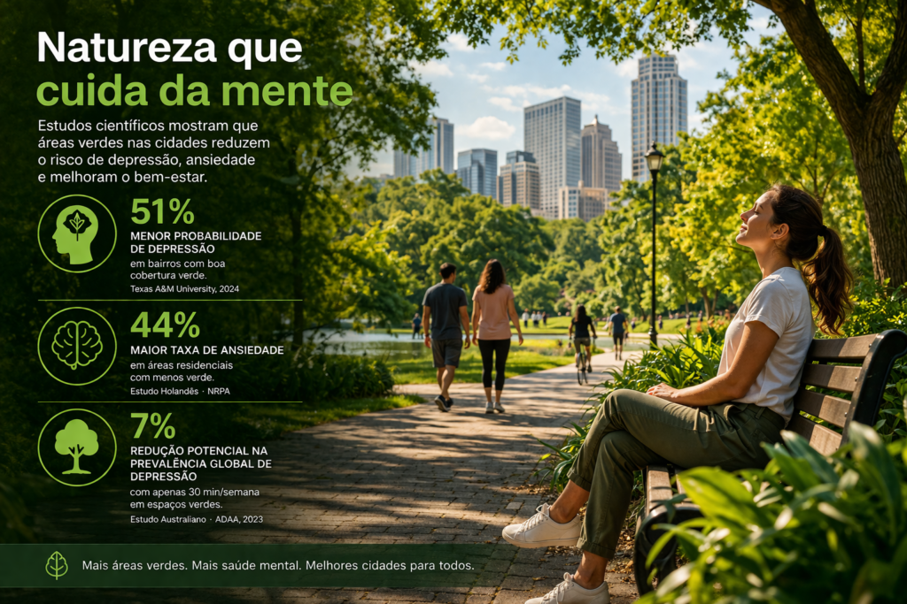 A relação entre meio ambiente e qualidade de vida acaba de ganhar mais um reforço científico e com implicações diretas para políticas públicas. Um estudo recente revela que a presença de áreas verdes nas cidades pode ser um fator decisivo na prevenção da depressão e de outros transtornos mentais.